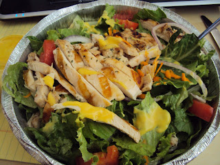 For lunch, I ordered this delicious salad from Cobbs: romaine, tomatoes, cucumbers, 3 oz grilled chicken, with honey mustard- which I proceeded to spill my diet soda all over. Matt rescued me with a small spicy grilled chicken thai wrap from Revolutionary Soup and an iced tea. Weight watchers says 6pts+.